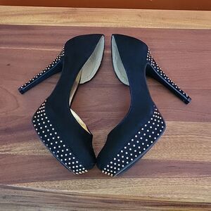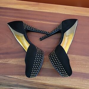 BRAND NEW NINE WEST D'ORSAY HIGH HEEL STILETTOS GOLD STUDDED EMBELLISHMENTS SHOE SIZE 8M COLOR BLACK &GOLD STUDDED ROUND TOE MADE WITH FABRIC UPPER BALANCE MANMADE MATERIALS HEEL HEIGHT MEASUREMENTS APPROX 5"INCHED THIS ITEMS IS BRAND NEW WITHOUT TAG CHECK THE PICTURES
