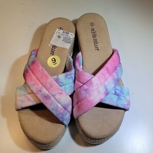 DURABLE OUTSOLE SANDAL CONSTRUCTION TEXTILE, POLYURETHANE UPPER TEXTILE, MANMADE LINING TPR OUTSOLE SANDAL DETAILS OPEN TOE SLIP-ON PADDED FOOTBED WITH 1-IN. PLATFORM THIS ITEMS IS BRAND NEW WITHOUT TAG OR BOX SANDAL WAS THE FLOOR MODEL CHECK THE PICTURES (NO TRADES REASONABLE OFFERS PLEASE BUNDLE FOR BETTER DEALS)