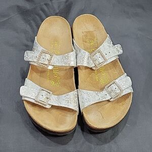 BRAND NEW PAPILLION ORIGINAL BIRKENSTOCK FUBBELT SANDAL SIZE L6 M4 COLOR GRAY &WHITE FLORAL PRINT DESIGN PATTERN The BIRKENSTOCK Arizona Spotted Metallic combines traditional elements from nature with a completely new, glamorous look. The individually adjustable unisex sandal shows itself here in elegant nubuck leather, which has been refined with metallic highlights in the form of raw, unprocessed stones. The sparkling upper material reminds one of a shimmering rainbow or the shiny inside of a shell. A real eye-catcher!Anatomically shaped cork-latex footbed Upper: nubuck leather