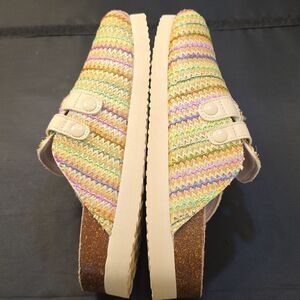BRAND NEW ROCKET DOG WOMENS ABEL PLUS CLOG SIZE 6.5 MULTI-COLOR LIKE GREEN, ORANGE,CREAM AND MORE Step into comfort with these vibrant slip-on shoes. Perfect for casual outings, these shoes feature a multicolor design that adds a pop of color to any outfit.Unconventionally artsy, the Abel Plus women's clog from Rocket Dog fits your bohemian vibe. Featuring a raffia upper with a natural/taupe design, this clog has dual buckle straps for a secure fit. The small platform adds a little lift, while the flatform sole is durable.