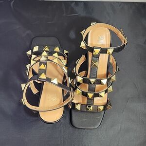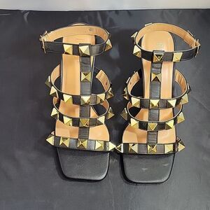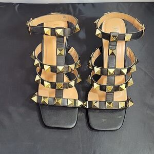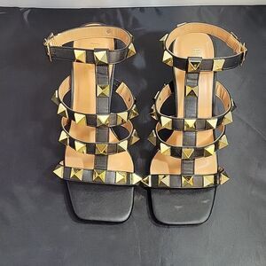 BRAND NEW ROUGE HELUIM GOLD STUDDED EMBELLISHMENTS GLADIATOR SQUARE TOE ADJUSTABLE BUCKLE ANKLE STRAP SANDAL SIZE 61/2 COLOR BLACK &GOLD STUDDED EMBELLISHMENTS DESIGN MADE WITH ALL MAN MADE MATERIALS HEEL HEIGHT MEASUREMENTS APPROX 3"INCHES THIS ITEMS IS BRAND NEW WITH TAG AND BOX CHECK THE PICTURES