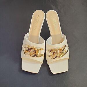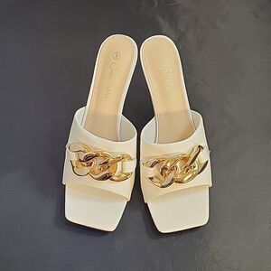 BRAND NEW SHOELAND MELROSE STYLE SQUARE TOE SLIP-ON FOOT OPEN TOE GOLD CHAIN LINKING SANDAL COLOR WHITE SIZE 9 HEEL HEIGHT MEASUREMENTS APPROX 3.25"INCHES MADE WITH ALL MAN MADE MATERIALS THIS ITEMS IS BRAND NEW WITH TAG AND BOX CHECK THE PICTURES