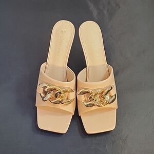 BRAND NEW SHOELAND MELROSE STYLE SQUARE TOE SLIP-ON FOOT OPEN TOE GOLD CHAIN LINKING SANDAL COLOR CREAM SIZE 81/2 HEEL HEIGHT MEASUREMENTS APPROX 3.25"INCHES MADE WITH ALL MAN MADE MATERIALS THIS ITEMS IS BRAND NEW WITH TAG AND BOX CHECK THE PICTURES