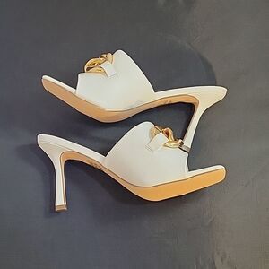 BRAND NEW SHOELAND MELROSE STYLE SQUARE TOE SLIP-ON FOOT OPEN TOE GOLD CHAIN LINKING SANDAL COLOR WHITE SIZE 8.5 HEEL HEIGHT MEASUREMENTS APPROX 3.25"INCHES MADE WITH ALL MAN MADE MATERIALS THIS ITEMS IS BRAND NEW WITH TAG AND BOX CHECK THE PICTURES