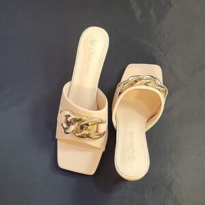 BRAND NEW SHOELAND MELROSE STYLE SQUARE TOE SLIP-ON FOOT OPEN TOE GOLD CHAIN LINKING SANDAL COLOR CREAM SIZE 9 HEEL HEIGHT MEASUREMENTS APPROX 3.25"INCHES MADE WITH ALL MAN MADE MATERIALS THIS ITEMS IS BRAND NEW WITH TAG AND BOX CHECK THE PICTURES
