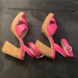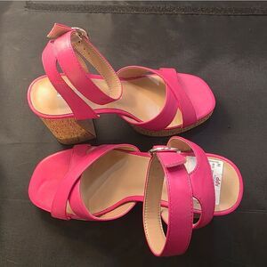 BRAND NEW SODA STRAPPY BLOCK HEEL OPEN TOE WOMENS SANDAL SIZE 61/2 COLOR PINK &CORK BOTTOM all man-made materials lining sole Step out in style with these vibrant pink strappy sandals from Soda. Perfect for any occasion, these sandals offer both comfort and flair.heel height measurements approximately 4"inched THIS ITEMS IS BRAND NEW WITH TAG NO BOX CHECK THE PICTURES