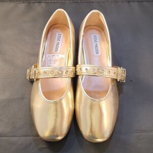 BRAND NEW STEVE MADDEN BALLET WITH STRAP CHIC GOLD MARY JANE SIZE 8M COLOR GOLD elegant Mary Jane flats with a sleek design. Features a stylish buckle strap.round toe adjustable buckle closure all man-made materials pu upper linning sock TPR outsole no heel THIS ITEMS IS BRAND NEW WITH TAG NO BOX CHECK THE PICTURES