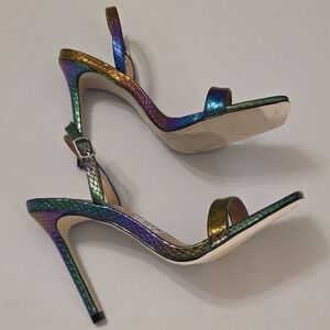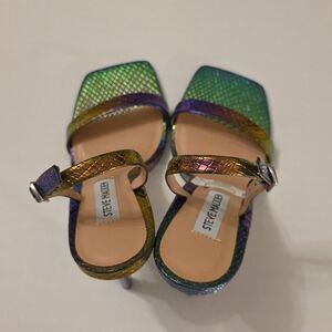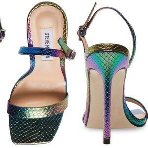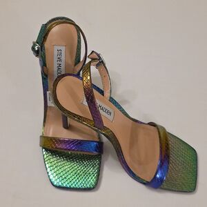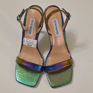 BRAND NEW STEVE MADDEN BETTHANY MULTI SNAKE STILETTO HEEL with ANKLE STRAP SIZE 6M COLOR LIKE GREEN &PURPLE and MORE minimalist strap design emphasizes the stripped down look of the BETHANY stiletto sandal. Stiletto sandal Buckle closure leather upper material Vegan leather lining Synthetic sole Imported levate your style with these captivating Steve Madden heels, featuring a striking blue and green color palette. The shoes boast a sleek stiletto heel and a chic ankle strap, offering both elegance and support. Their glossy, iridescent finish ensures you'll turn heads with every step.CHIC VAMPY ELEGANT A minimalist strap design emphasizes the stripped down look of the BETHANY stilettosandal. Stiletto sandal Buckle closure at ankle strap Square toe 4 inch heel height Vegan leather upper material Vegan leather lining Synthetic soleElevate your evening look with these striking Steve Madden heels, featuring a captivating blue and green iridescent finish. The sleek stiletto heel and elegant ankle strap add a touch of sophistication, making them perfect for any dressy occasion. THIS ITEMS IS BRAND NEW WITH TAG NO BOX CHECK THE PICTURES(FYI THE FIRST PICTURES IS JUST A MODEL TO SHOW WHAT THE SANDAL LOOK ON CHECK THE PICTURES)