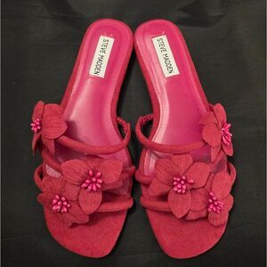 BRAND NEW STEVE MADDEN FLOWER WOMEN'S SANDALS 9M COLOR PINK all man-made materials lining upper balance man made materials Step into style with these elegant green floral sandals by Steve Madden. Perfect for any occasion, these shoes offer both comfort and fashion.Step into style with these chic pink floral slide sandals. Perfect for any casual outing, these sandals offer both comfort and elegance.THIS ITEMS IS BRAND NEW WITH TAG NO BOX CHECK THE PICTURES