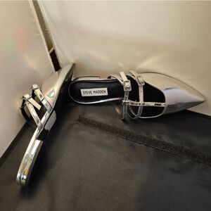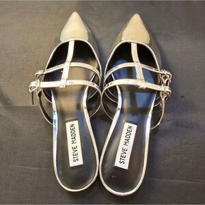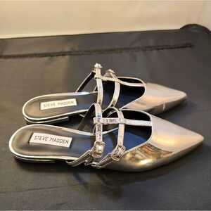 BRAND NEW STEVE MADDEN POINTED TOE DOUBLE STRAP MULES SIZE 7.5M COLOR SILVER METALLIC Stylish tan multi slip-on shoes. Perfect for casual wear.all man-made materials lining man-made material Synthetic upper cut out design adjustable buckle strap polished studs accentuate the strappy silhouette of a pointed toe flat in sleek leather THIS ITEMS IS BRAND NEW WITH TAG NO BOX CHECK THE PICTURES OF THE PICTURES(FYI THE FIRST PICTURES IS JUST A MODEL TO SHOW WHAT THE SANDAL LOOK ON CHECK THE PICTURES)