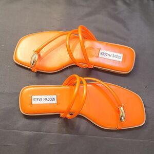 BRAND NEW STEVE MADDEN VIBANT ORANGE WOMENS sandalS SIZE 71/2M Step out in style with these vibrant orange sandals. Multi Straps with square gold toe accents designs Perfect for any casual outing, these sandals offer both comfort and flair.PU upper/Sole TPR outsole all man-made materials lining upper balance man made materials THIS ITEMS IS BRAND NEW WITH TAG NO BOX CHECK THE PICTURES (FYI THE FIRST PICTURES IS JUST A MODEL TO SHOW WHAT THE SHOE LOOK ON CHECK THE PICTURES)