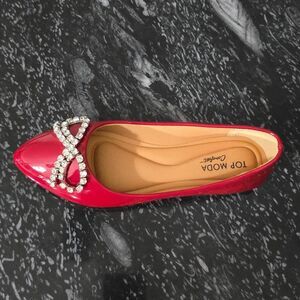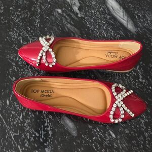 BRAND NEW TOP MODA COMFORT with RHINESTONE BOW WOMEN FLAT SIZE 71/2 COLOR RED all man-made materials lining man-made material cut out design pointed toe slip-on Stylish flats featuring a sparkling rhinestone bow. Perfect for adding a touch of glamour to any outfit.THIS IS BRAND NEW WITH TAG NO BOX CHECK THE PICTURES