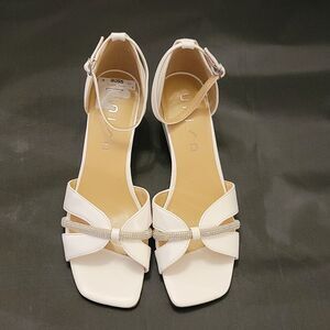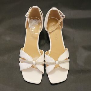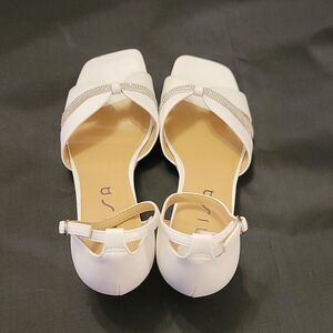 BRAND NEW UNISA ELEGANT LOW WEDGE OPEN TOE SANDAL 81/2M COLOR WHITE WITH SILVER RHINESTONE GLITTER STRAP IN TOP all man-made materials lining upper balance heel height measurements approximately 2"inched step out in style with these elegant white wedge sandals. Perfect for any occasion, these shoes offer both comfort and sophistication.THIS ITEMS IS BRAND NEW WITH TAG NO BOX CHECK THE PICTURES(FYI THE FIRST PICTURES IS JUST A MODEL TO SHOW WHAT THE SHOE LOOK ON CHECK THE PICTURES)