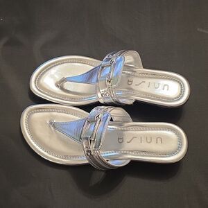 BRAND NEW UNISA METALLIC MULE THONG WOMEN'S SANDALD SIZE 61/2M COLOR SILVER Elegant metallic sandals with a sleek design. Perfect for adding shine to any outfit.all man made materials lining upper balance man made materials lining upper balance man made materials heel height measurements approximately 1'1 inches THIS ITEMS IS BRAND NEW WITH TAG NO BOX CHECK THE PICTURES