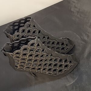BRAND NEW FOREVER STUDDED CUT OUT DETAILS GLADIATOR SANDAL CAGED BOOTIES SIZE 7 COLOR BLACK& SILVER PEEP TOE HEEL HEIGHT MEASUREMENTS APPROX 4"INCHED THIS ITEMS IS BRAND NEW WITH TAG AND BOX CHECK THE PICTURES