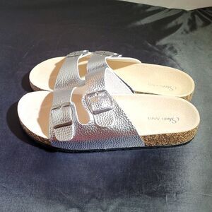 BRAND NEW SHOE LAND VIVIANA ROSE SILVER SANDAL SIZE 8 ROUND TOE SLIP-ON STYLE DOUBLE BUCKLE STRAP CLOSURE ALL MAN-MADE MATERIALS LINING BALANCE MAN MADE BRAND NEW IN THE BOX CHECK THE PICTURES