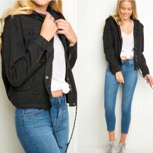 This is a Brandy Melville Hailey Zip Hood Jacket in black, designed for women in one size. It is made of cotton with a solid pattern and a short length. The jacket features a zip closure, hood, pockets, and a classic utility style, suitable for casual occasions in the summer, fall, and spring seasons. No flaws.