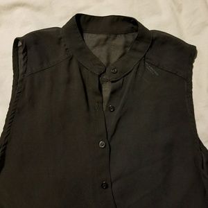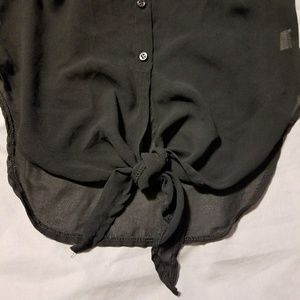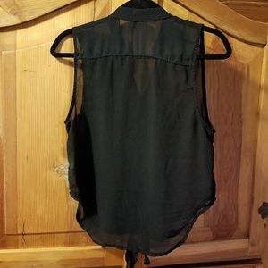 Black, sheer button down tank with tie at bottom. Made in Italy. 65% cotton, 35% polyester. No size indicated, but would fit a size Small.
