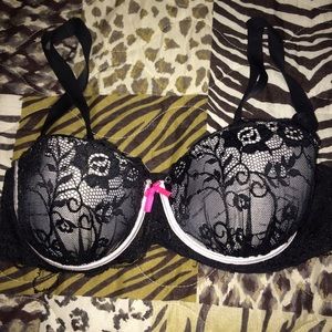 Four different bras here! 1️⃣ Red & black with sparkles(Metallic)- Push up, wires in both cups, size 36C! 2️⃣Leopard Print- Push up, wires in both cups, size 38C. 3️⃣ White bra with black lace- Push up, wires in both cups, size 36C. 4️⃣ Pink Leopard-Push up, wires missing out of both cups, size 36C! NOT VICTORIA SECRET; from Rue21