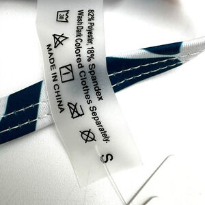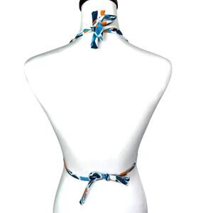 The product is a Brazilian-made women's small blue and orange geometric bikini top, featuring a halter strap and a padded design for comfort and support. Made from a blend of polyester and spandex, this 1-piece swim top is perfect for a day at the beach or pool. It includes features such as UV protection, a built-in bra, quick-drying fabric, and a chlorine-resistant finish. This trendy and vibrant bikini top is ideal for various beach-themed activities, from lounging by the water to participating in water sports or attending a beach party.