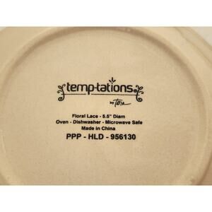 Bread and Butter plates from Temp-tations. The pattern is Floral Lace. These plates have a basket weave pattern on the center of the plate. On top of that are dark blue and red designs in the middle of the plate. There are dots around the edge. These are 5.5" diameter plates suitable for bread and butter at your table setting. These are a unique pattern for your table or buffet. This is a set of 4.