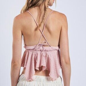 Solid Color Sleeveless Adjustable Tie Strap Asymmetric High-Low Ruffle Sweetheart Open Neck Crop Top SELF:100%POLY LINING:100%POLY * Model Info: Height: 5'10.5" / 179 cm Bust: 33" / 84 cm Waist: 24" / 61 cm Hips: 35" / 89 cm