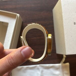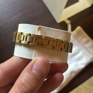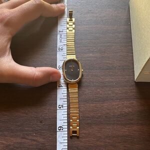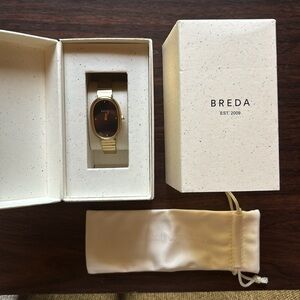 Breda Jane watch with gold band and black watch face. Minor marking on last two bands and “Breda” clasp where it fastens. I have shortened this watch and taken out a few links to fit my wrist snug. They will be included and are pictured. For reference I have taken a measurement of the watch and my wrist is 6 inches in circumference. I am the only owner and purchased brand new. Comes with box little dust bag.