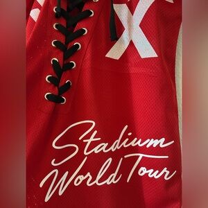 Bold red mini dress with lace-up front and back zipper. Features customized graphic print and sporty design. Jersey material.