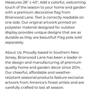 Measures 28" x 40". Add a colorful, welcoming touch of the season to your home and garden with a premium decorative flag from Briarwood Lane. Text is correctly readable on one side. Our original artwork printed on polyester material designed for outdoor display provides unique designs that are as durable as they are beautiful!