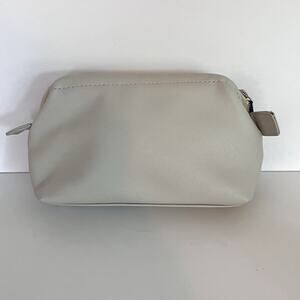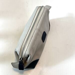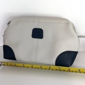 Authentic BRIC’S x Qatar Airways business-class amenity case/toiletry pouch in cream with dark blue faux-leather trim and silver-tone hardware. Compact zip pouch—great as a dopp kit, cosmetics bag, or tech cord organizer. Measures approx. 8.5" x 5" x 2".