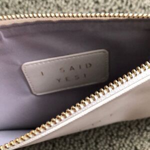 New zip pouch that reads BRIDE on the outside and I SAID YES! On the inside. Off white with gold letters.