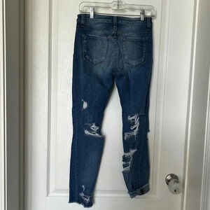 Bridge By Gly mid rise ankle skinny jeans in size 27. Button, zipper, pockets, distressing on both front and back. Can be worn rolled/cuffed at bottom of straight (pictured both ways). Great used condition, no notable flaws. Material pictured. Approx measurements pictured.