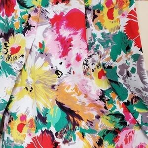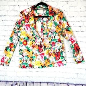 • Bright floral blazer with a solid white background and many varieties of neon and bright colors. One button secures at waist and 2 faux pockets. Lined on right and left sides at chest