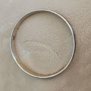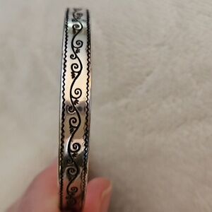 This elegant silver bangle features intricate swirl designs, perfect for adding a touch of sophistication to any outfit.