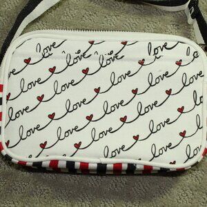 This is a BRIGHTON Canvas Crossbody Bag/Purse in a lovely "LOVE SCROLL" design. The bag features a heart and love pattern, with ivory, red, and black exterior colors. It has a rectangle shape with dual zipper closure, adjustable crossbody strap in ivory/black, and silver tone hardware. The bag is small in size, with inner pockets and a fabric lining in white and red. Perfect for travel, casual, or workwear occasions.