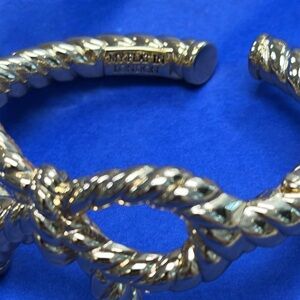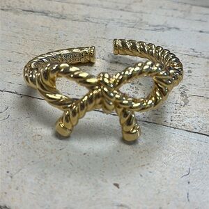 Make a statement with this bold and elegant cuff bracelet from My Flat In London, a designer line under Brighton. This gold-tone cuff features a textured twisted rope design with a striking knot detail at the center and crystal-accented end caps for a hint of sparkle. A sophisticated piece that adds a chic nautical flair to any look.