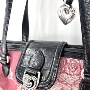 Stylish red Brighton weekender style handbag featuring a floral jacquard pattern, zipper closure with overlay snap closure over top. Faux croc handles and overlay, silver hardware, front heart Brighton style hardware and branded heart charm. Also has attached keychain clasp inside, silver metal feet and serial #C294764.