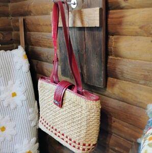 BRIGHTON RAFFIA WOVEN TOTE PURSE WITH RED LEATHER STRAPS & ACCENT. CHARM DETAIL