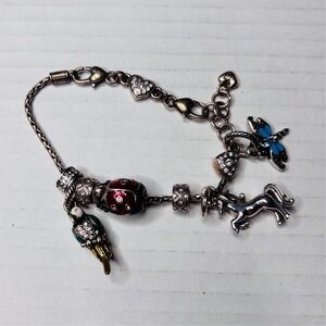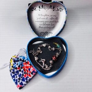 This well-crafted Brighton Slide Charm Holder Bracelet is in excellent condition and comes with 7 charming Brighton charms. Comes with Brighton jewelry bag and tin can