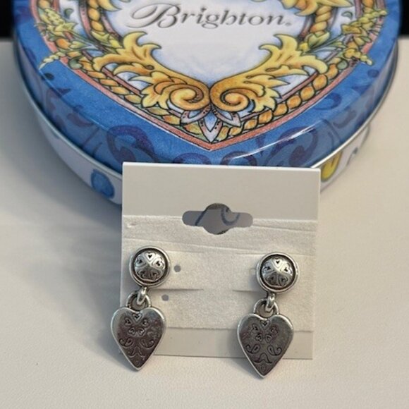 ~Post-back stud connected to a dangling heart charm, each engraved with a decorative pattern.