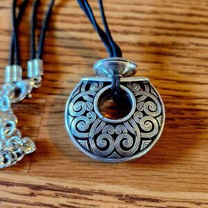 Special Features: Puff Disc, Scroll Work, Silver Plate, Vintage, Added topper detail, lobster claw clasp, Double Cord, Extension, Brighton charm at nape. Lovely 😍