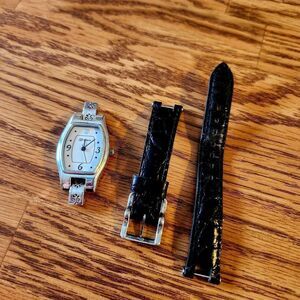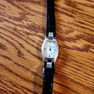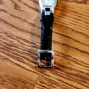 Special Features: Beautiful Rectangular Crystal in Silver Plate finish, Etched Details, Textured Black Leather band with Silver Accents, Can be Reversed to Redish Brown Leather, White Crystal with Black Markers, Second Hand Function, NEW BATTERY! 7 Holes for a perfect fit, Vintage!! Love it ❣️ and comes with pretty Embroidered Linen Bag shown!