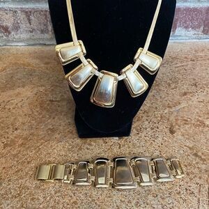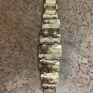 Length - up to 7 3/4" Adjustable Closure, Fold over clasp, Finish- Gold plated, Brushed gold, Art Deco style. Part of a matching set with a necklace. See pictures for details.