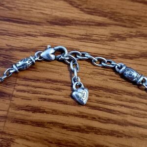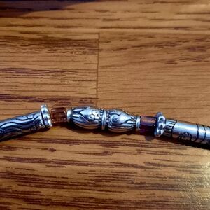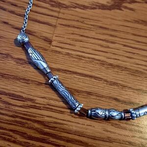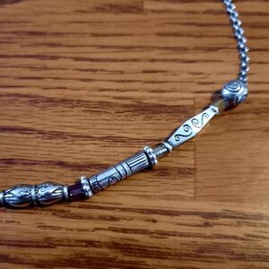 Special Features: Beautiful Etched Elongated Beads, Alternating Amber Crystal, Silver Plate finish, Round link Chain, lovely texture, Decorative end caps, lobster claw clasp, extension, Brighton charm at nape. Gorgeous Vintage piece 💕