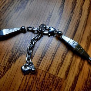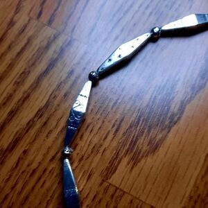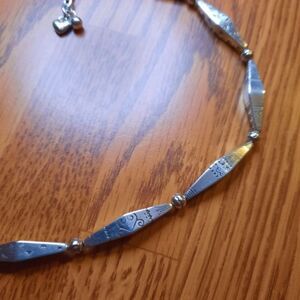 Special Features: Elongated Geometric Beads, Pretty Etching details on each, alternating rounds Beads, Choker length, Silver Plate finish, lobster claw clasp, extension, Brighton charms at nape. Lovely 🌟