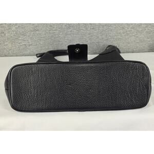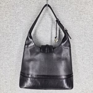 This Brighton handbag features a structured silhouette in textured black leather with a flap closure and signature heart charm detail. The adjustable shoulder strap offers a 10" drop on the last hole, making it ideal for shoulder carry. Interior compartments adds both function and style.