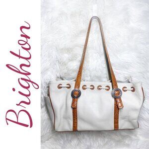 BRIGHTON White & Tan Pebbled Leather Satchel Shoulder Bag Croc Heart Detail
