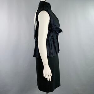 BRIONI dress in a black mercerized cotton featuring a high collar, ruffled panel design, sleeveless, open back, side zipper, and a hook & loop closure.