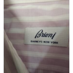 The BRIONI Striped Pink Long Sleeve Dress Shirt is a stylish and versatile piece perfect for various occasions such as parties, casual outings, and business meetings. Made in Italy with a linen and cotton blend fabric, this shirt features a spread collar with French cuffs, adding a touch of sophistication. The classic fit and button-front design make it an easy-care wardrobe staple suitable for all seasons. The vibrant pink stripes and designer brand name Barneys add a pop of color and prestige to this timeless and high-quality shirt.