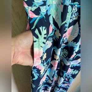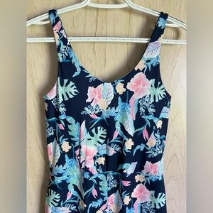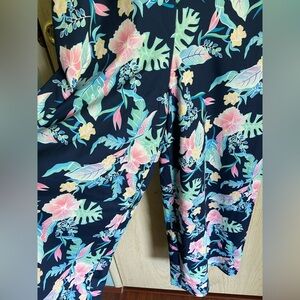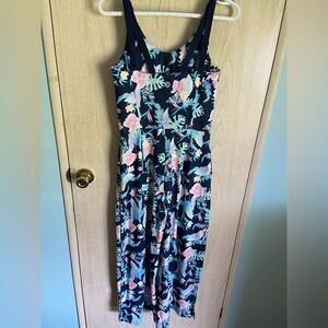 This wide leg jumpsuit is much prettier in real life than photo show. Navy blue with colorful flowers. Adjustable straps and built in bra. Wide leg style for comfort and style. Made of athletic material for stretch and ease.